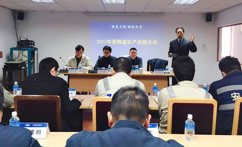 南通振华重型装备制造有限公司南通分公司2017年度精益生产总结大会2018年1月18日在南通开发区生产基地召开,大会由南通分公司姚卫平副总经理主持、上海振华重工总公司工艺部王兆荣总经理、分公司处级以上干部及部分生产骨干,上海电机学院科技处曹胜彬副处长、商学院马洪伟副院长、关田铁洪教授及“关田IE工作室”振华项目组成员出席了会议。
