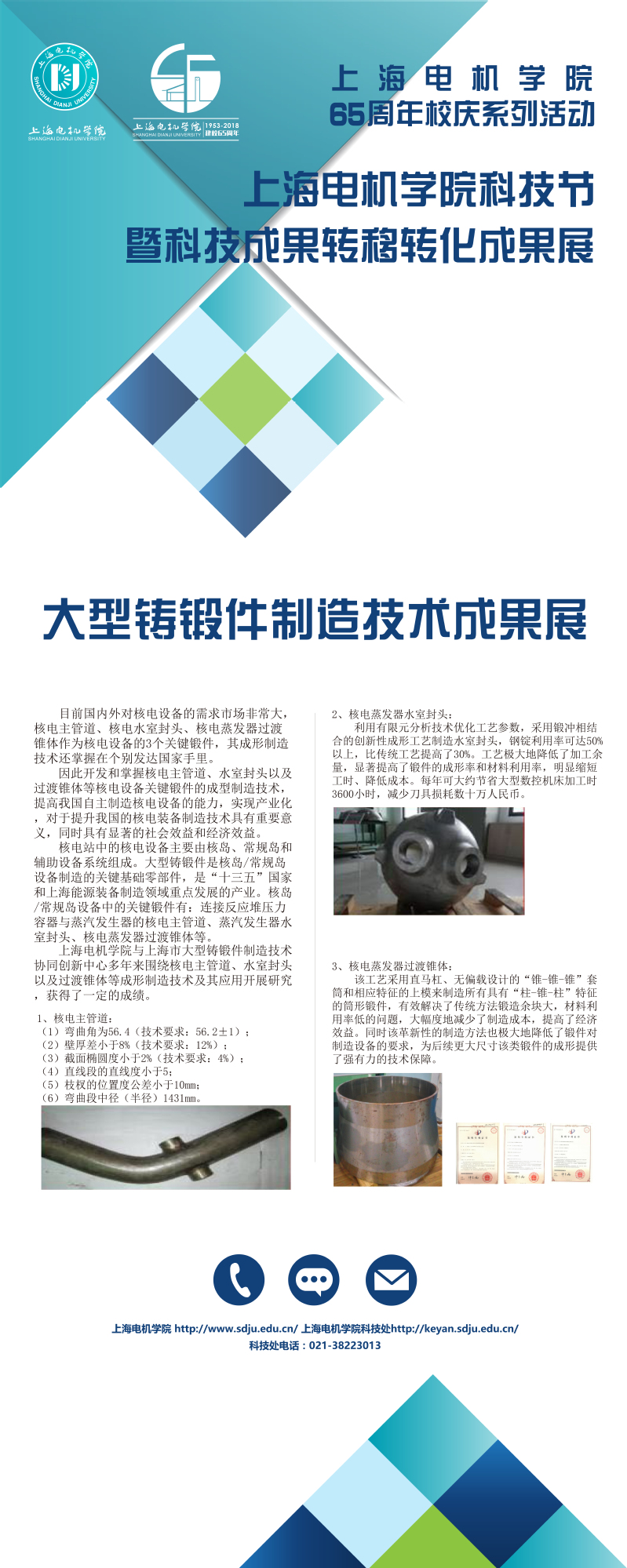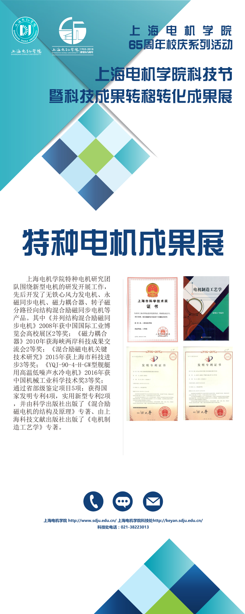 为庆祝上海电机学院建校65周年,推进学校优秀科技成果的转移转化,10月6日,上海电机学院科技成果转移转化成果展在临港校区图书馆报告厅举行。