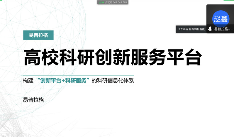 4月21日上午9点30,由北京易普拉格科技股份有限公司销售总监孟锐主持召开了易普拉格科研创新管理系统线上交流会,科技处全体工作人员参与了本次线上交流会。