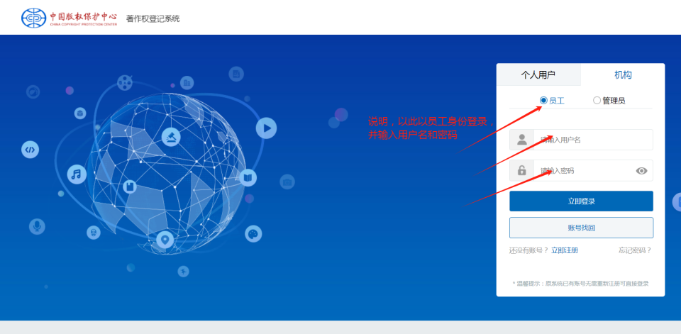 3、在“机构”栏,以员工身份登录,输入账号、密码