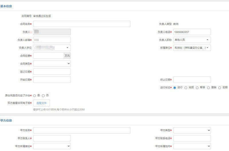 录入注意事项:(1)新系统录入横向项目时,将双方签字盖章后的合同上传;(2)新录入的项目,待科研秘书及科技处审核后会自动生成合同编号,科技处不再分配合同编号。